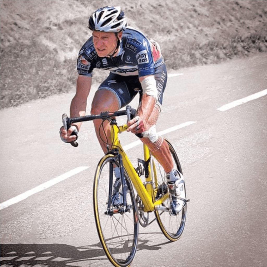 She bought a new bike a while back. It looks a bit on the small side for her, but she likes it because she can touch the ground with her toes, which is quite unusual for her. When me and the He Human stand there laughing she points out that some enormous German rider, Jens Voight once fell off his bike during the Torr. He was not able to get a replacement bike from the team car because the team car was ahead of him and they can’t turn round. So Jens Voight borrowed a child’s bike from the roof rack of a children’s team that was following, caught up with the team car and get his replacement bike.